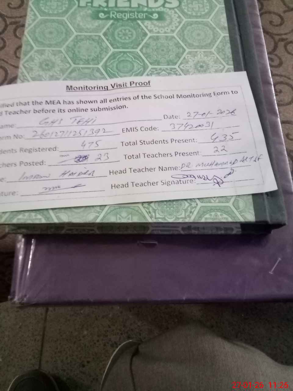 | Attendance Register | Head Teacher | MEA with School | Visit Proof |