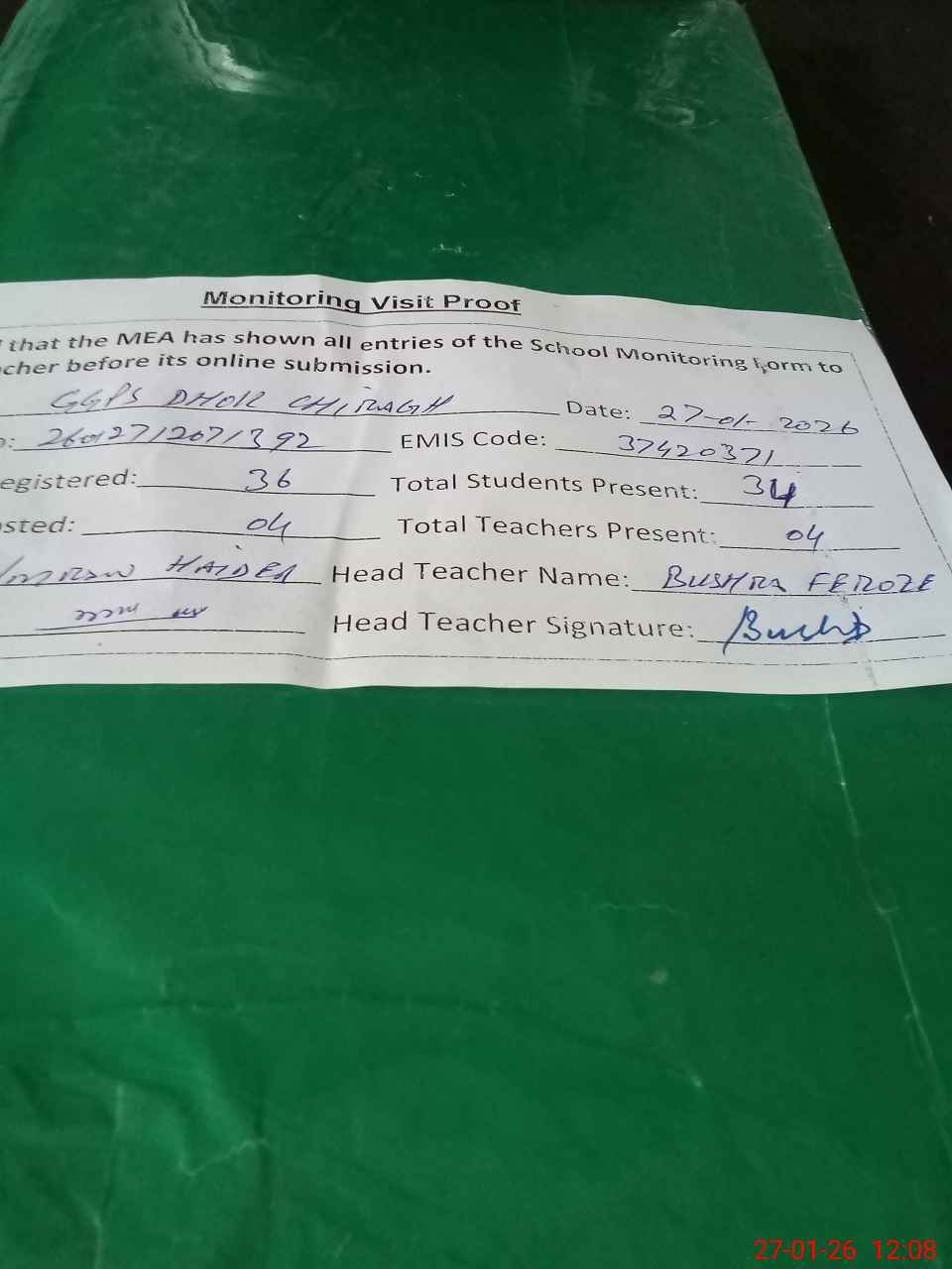 | Attendance Register | Head Teacher | MEA with School | Visit Proof |