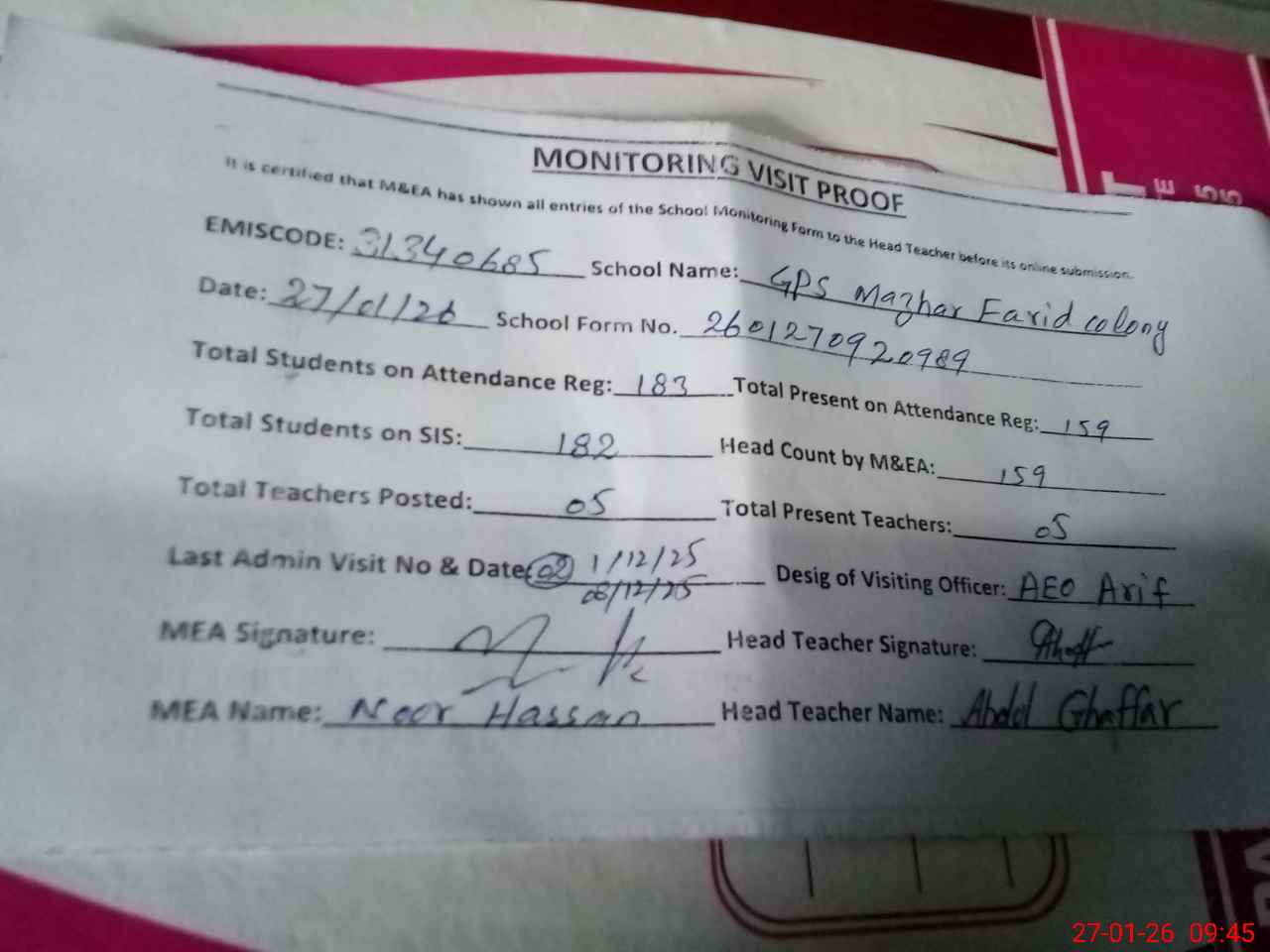 | Attendance Register | Head Teacher | MEA with School | Visit Proof |