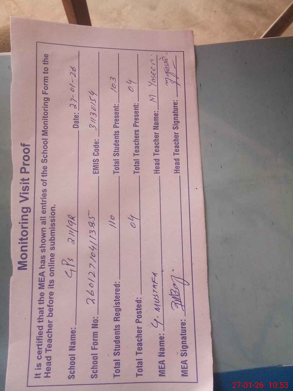 | Attendance Register | Head Teacher | MEA with School | Visit Proof |