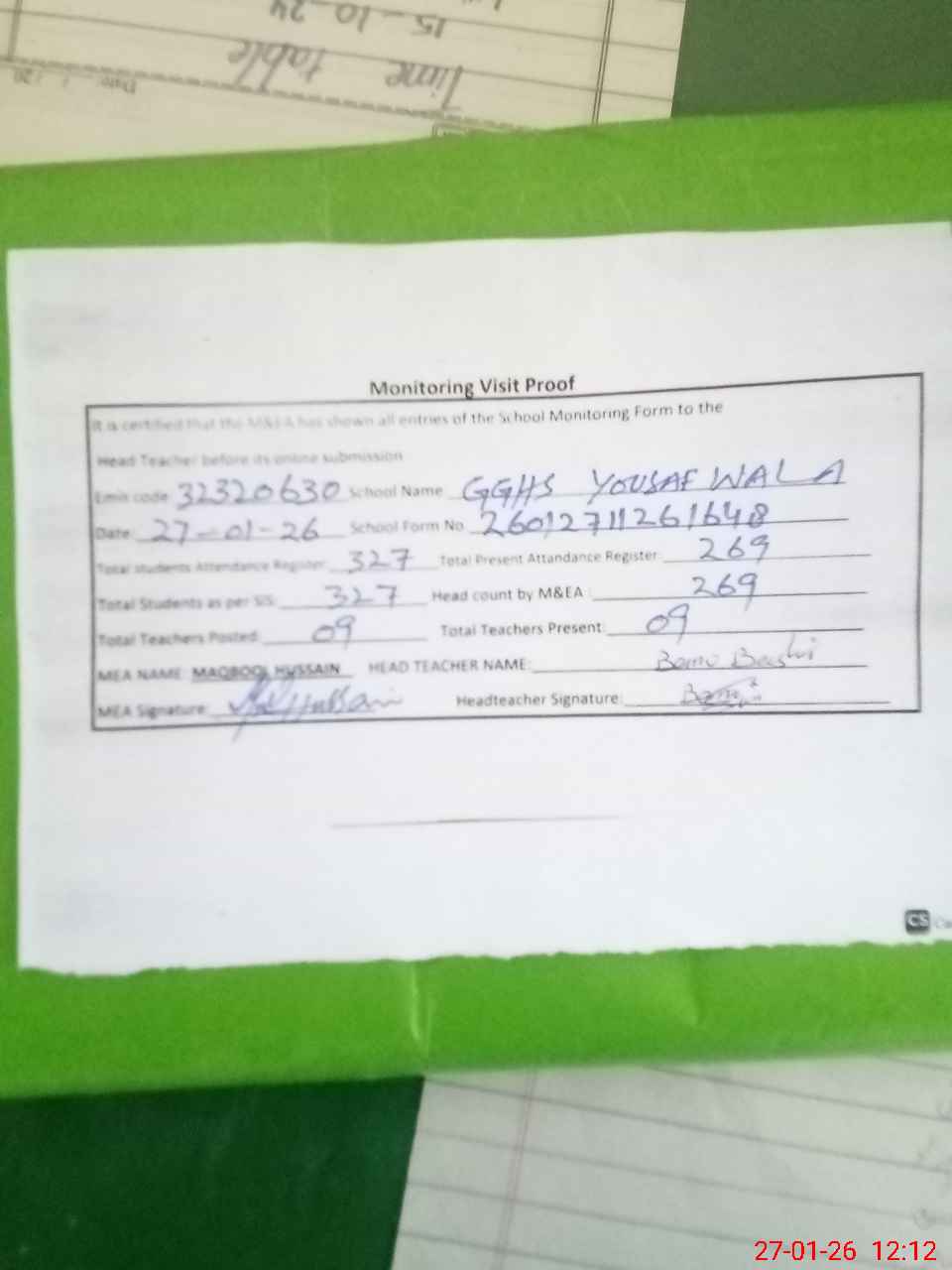| EMIS Code: 32320630 | Name of School: GGHS YOUSUF WALA | |||