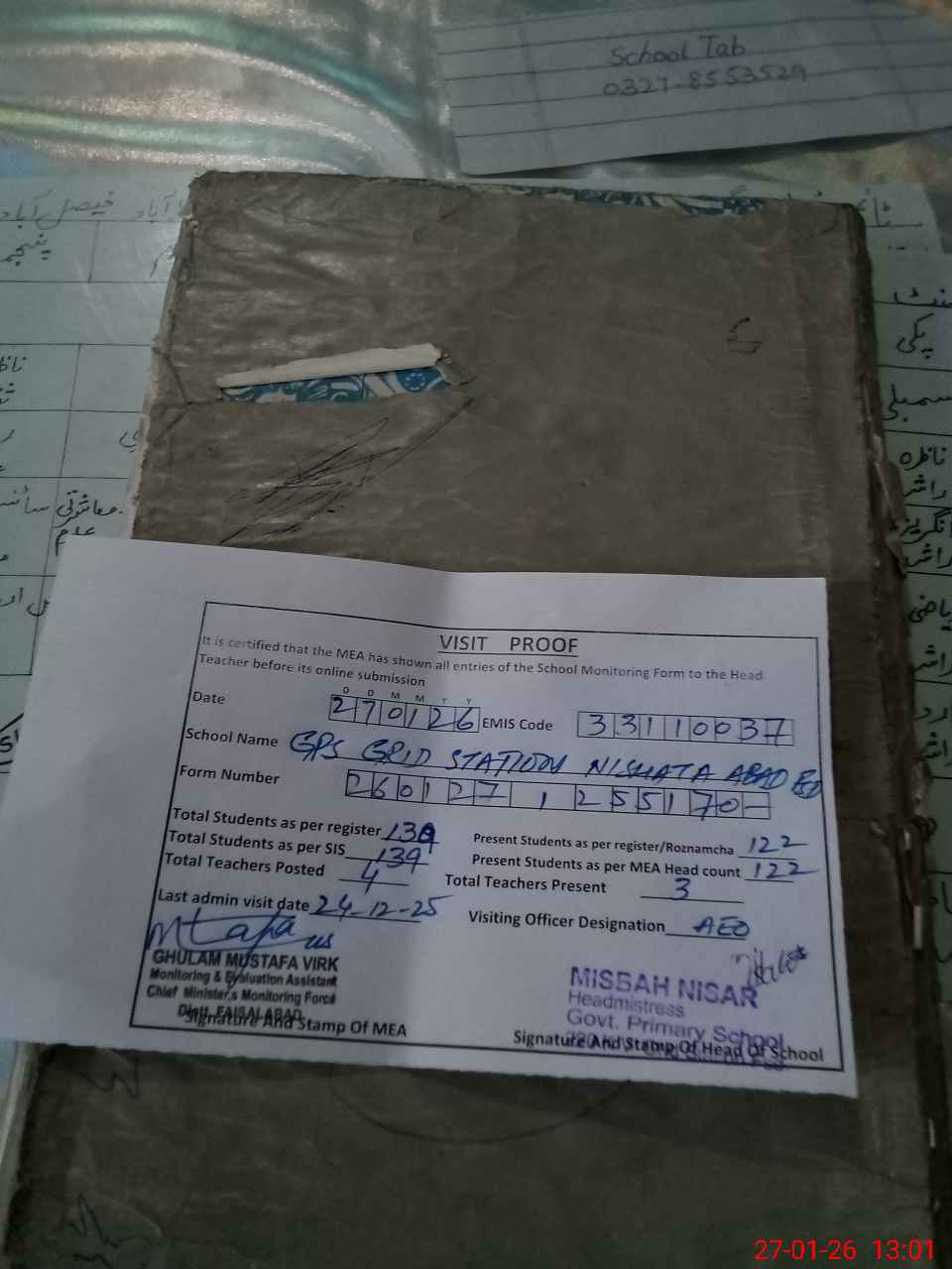 | Attendance Register | Head Teacher | MEA with School | Visit Proof |