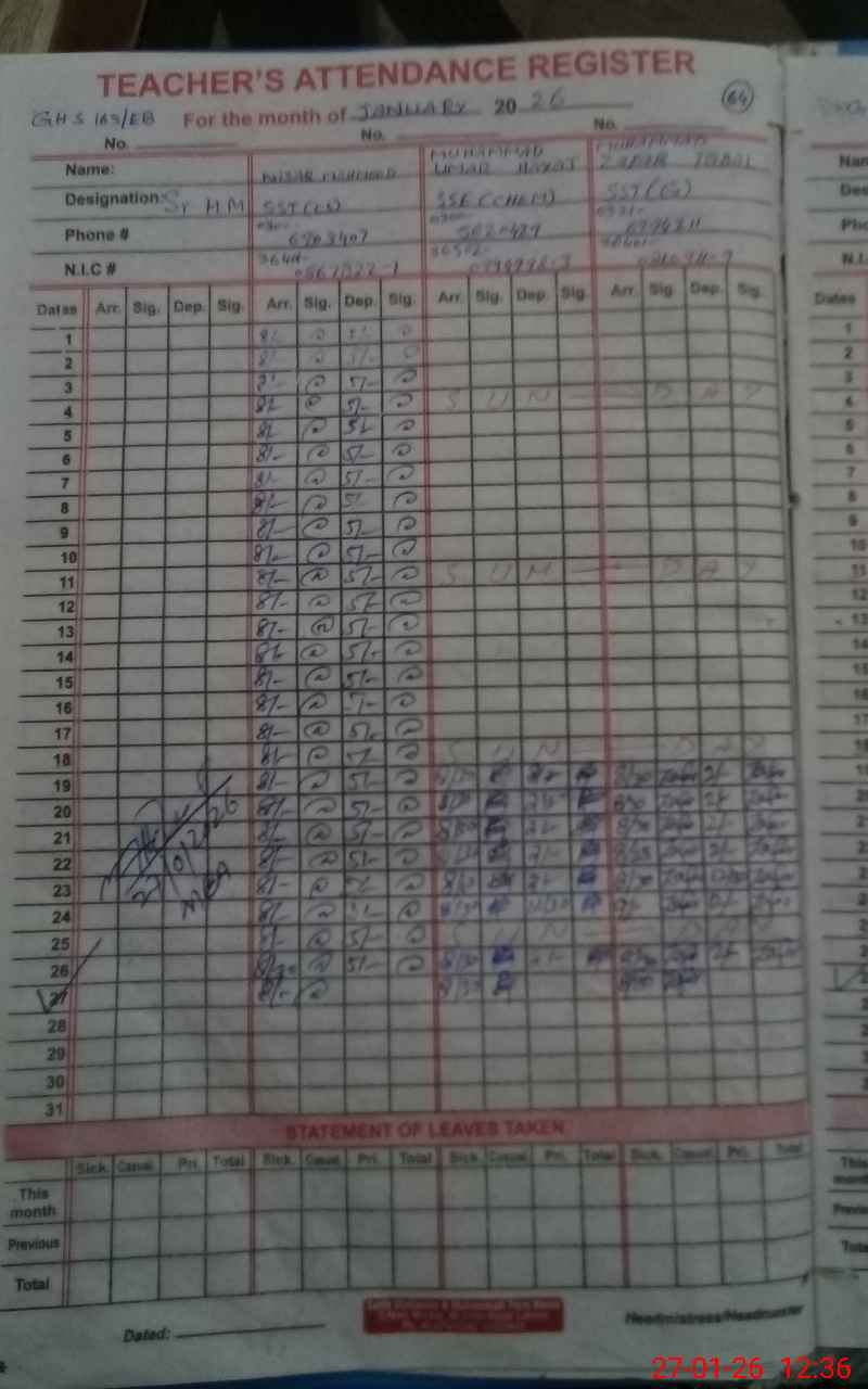 | 36**** | Na**** Ri**** | Sr. Headmaster (English) | Regular | 0 | 0 | 0 | 0 | 0 | 0 | 0 | 0 | 0 | Absent (Un-Authorized) |