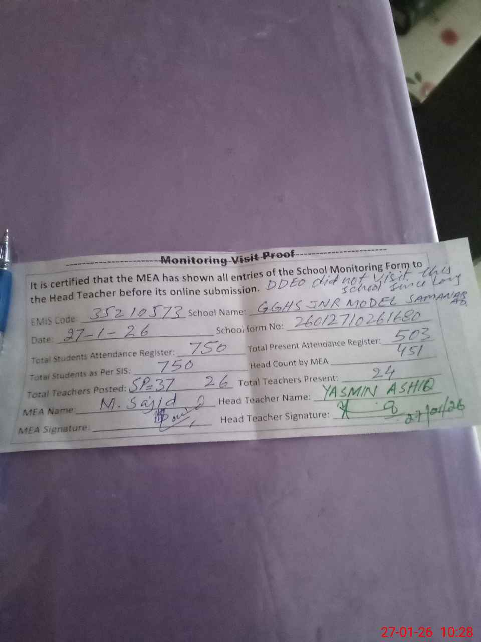 | Remarks (Use Separate Page if Required): Snr Clerk Qasim Mehmood came late at about 0945 hours and his attendance column was blank for two days so marked absent 52 students difference found in Roznamcha and head count Five toilets were without water container Only one soap found at students hand wash points 35210573 | |||||