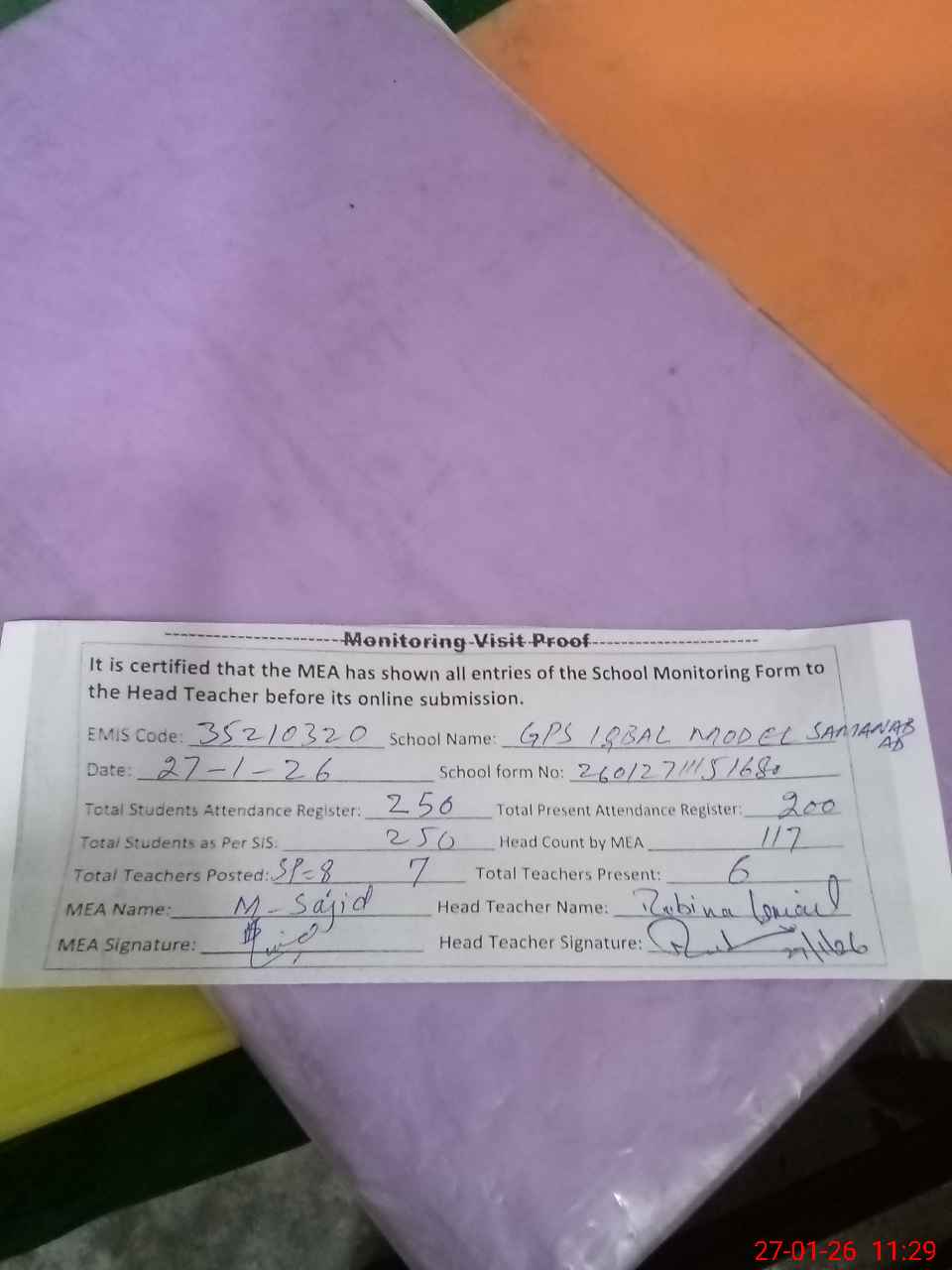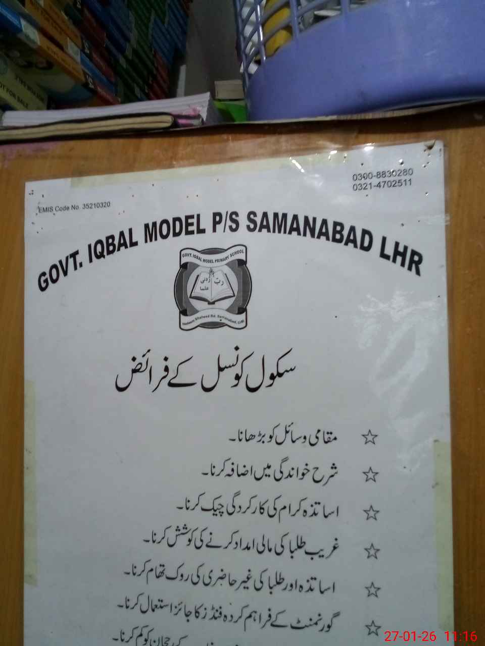 | EMIS Code: 35210320 | Name of School: GPS IQBAL MODEL SAMANABAD | |||