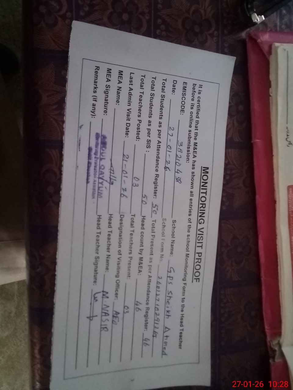 | Attendance Register | Head Teacher | MEA with School | Visit Proof |