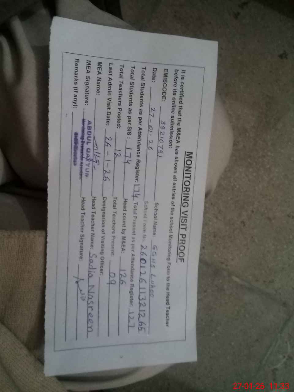 | Attendance Register | Head Teacher | MEA with School | Visit Proof |