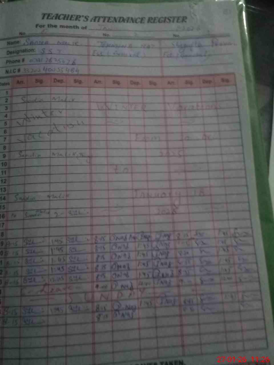| Name: SA**** MA**** Designation: (School Headmaster's/Headmistress's) SST Phone/Cell Number: 03**** |