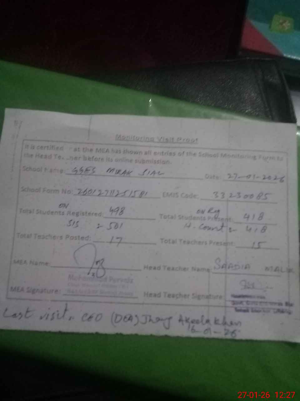 | Attendance Register | Head Teacher | MEA with School | Visit Proof |