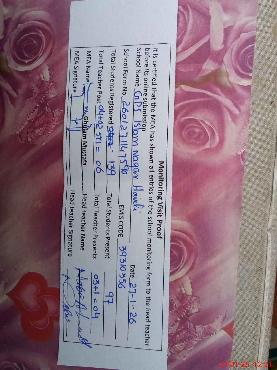 | Attendance Register | Head Teacher | MEA with School | Visit Proof |