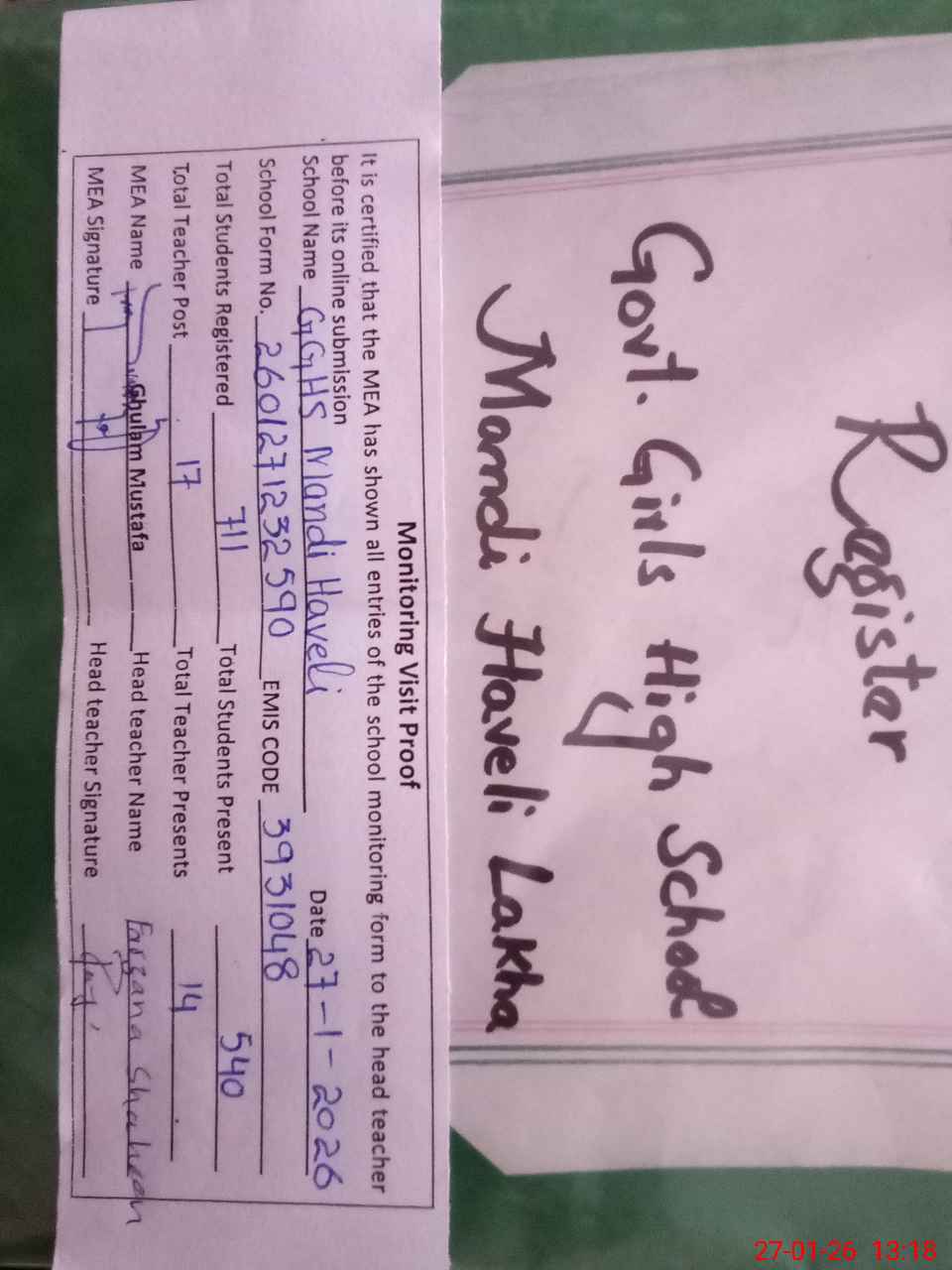 | Attendance Register | Head Teacher | MEA with School | Visit Proof |