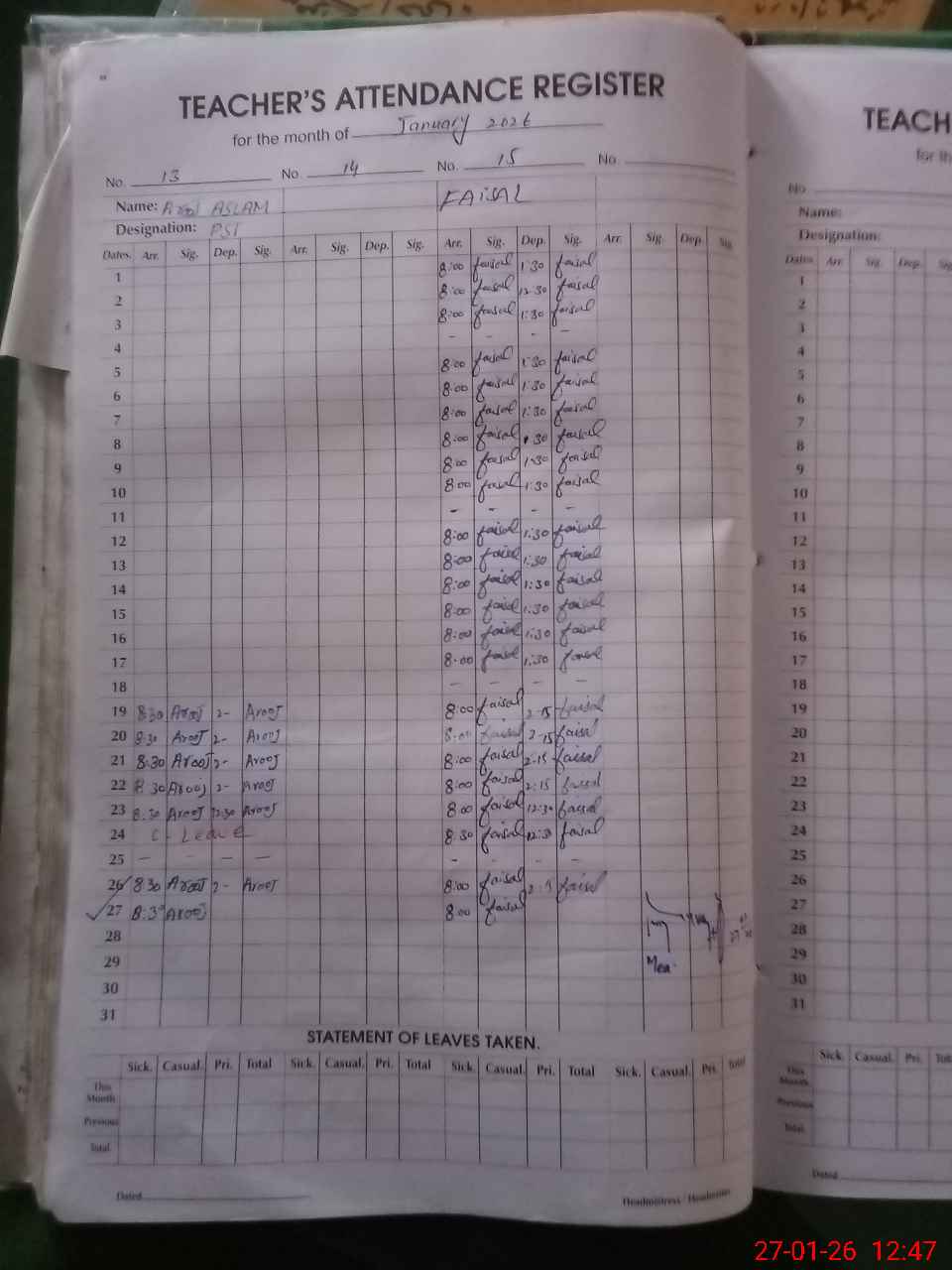| 35**** | Sh**** Ah**** | HEADMASTER | Regular | 0 | 0 | 0 | 0 | 0 | 0 | 0 | 0 | 0 | Exam Duty |