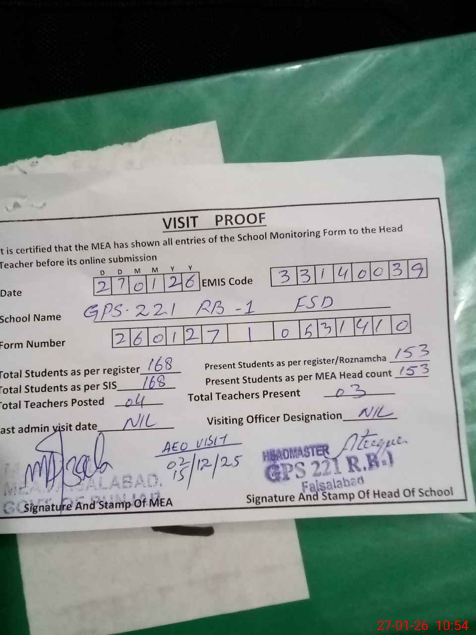 | Attendance Register | Head Teacher | MEA with School | Visit Proof |