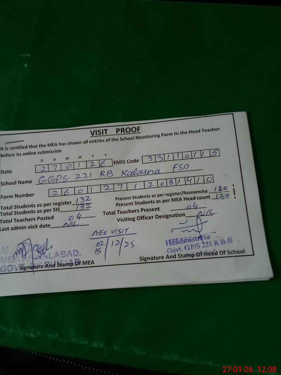 | Attendance Register | Head Teacher | MEA with School | Visit Proof |