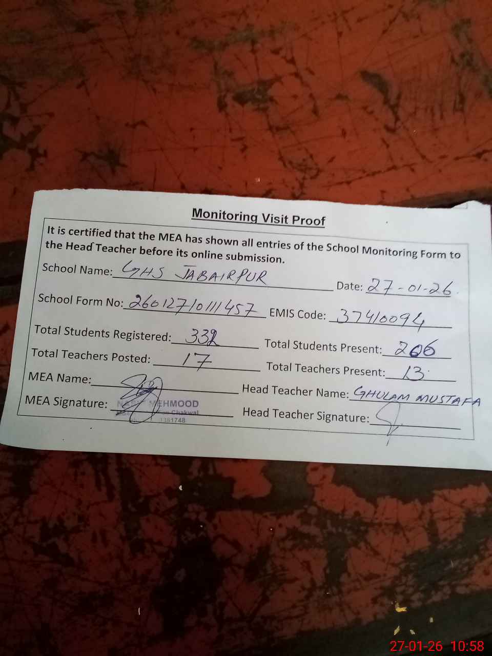 | Attendance Register | Head Teacher | MEA with School | Visit Proof |