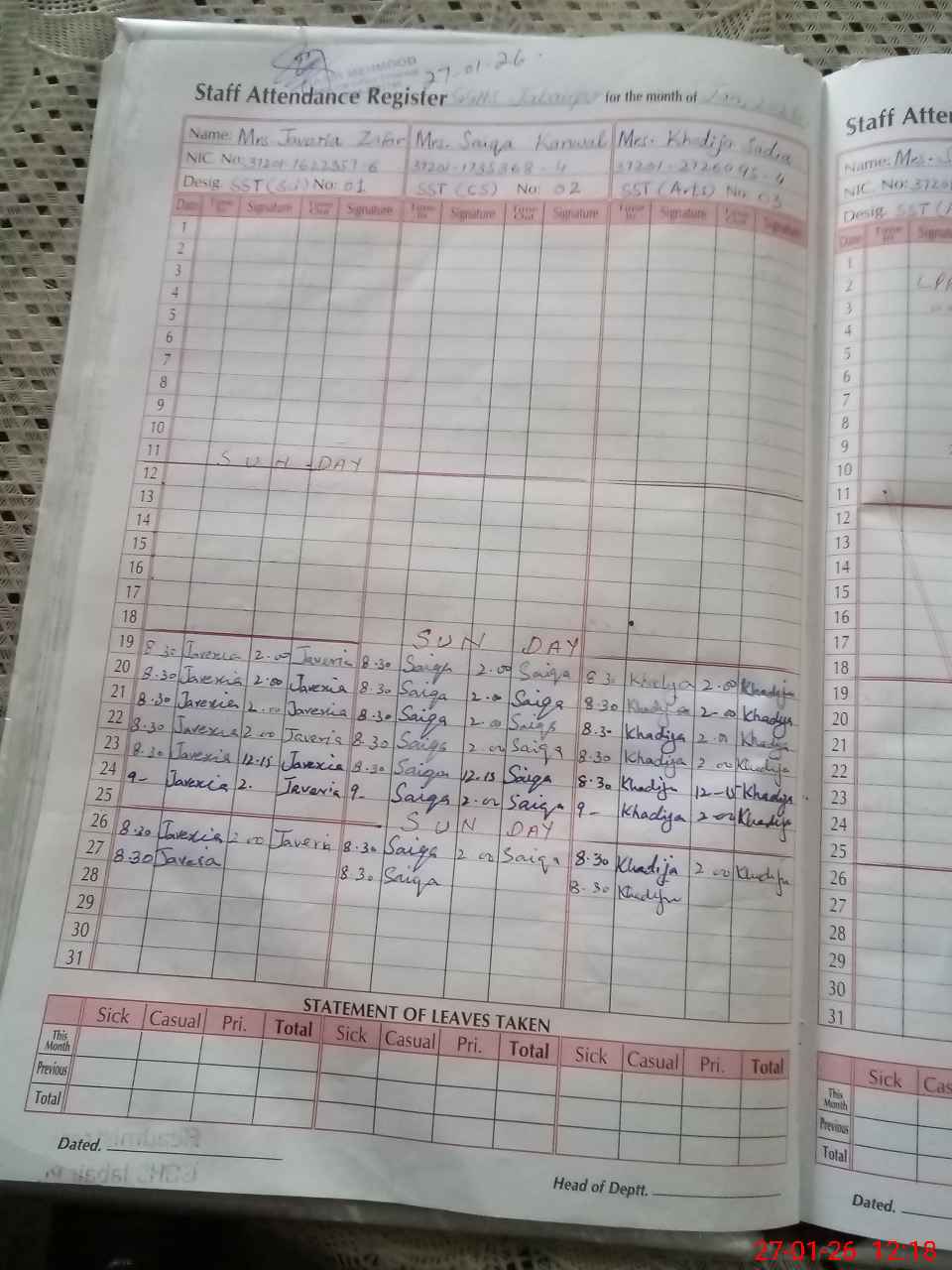 | CNIC | Full Name | Designation | R/C | Absence During Last Calender Month |