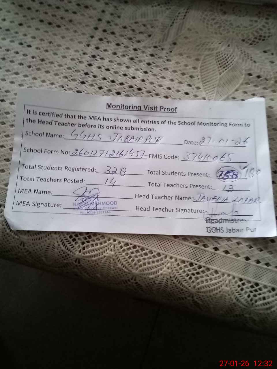 | Name: Ja**** Za**** Designation: (School Headmaster's/Headmistress's) I/c HEADMISTRESS Phone/Cell Number: 03**** |