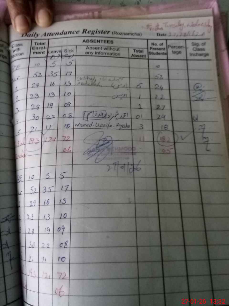 | Total Students Present | 0 | 10 | 22 | 22 | 28 | 30 | 18 | 182 | ||||||||
