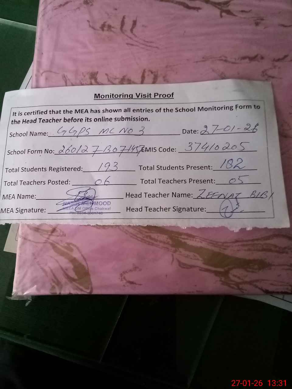 | Attendance Register | Head Teacher | MEA with School | Visit Proof |