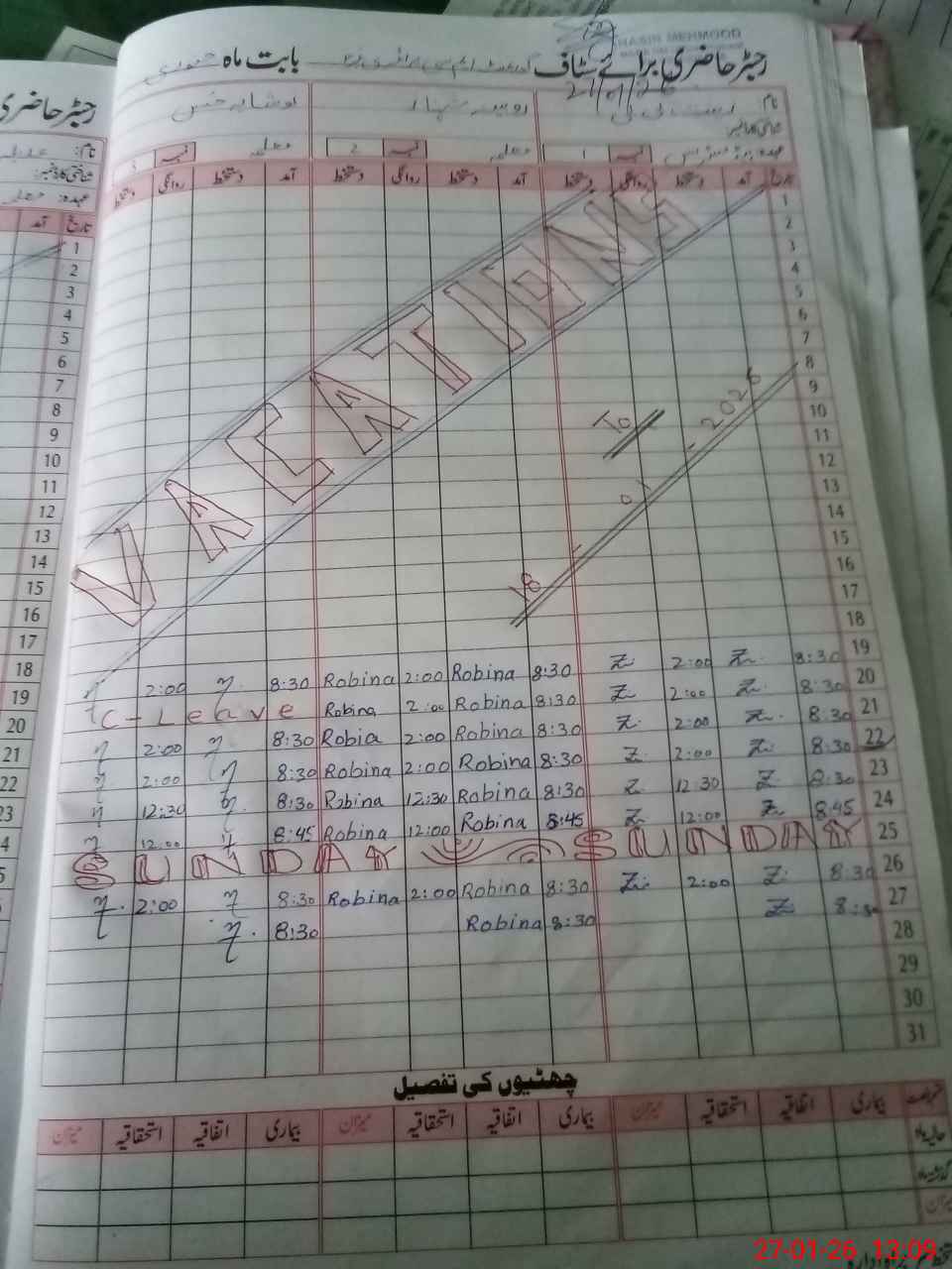 | CNIC | Full Name | Designation | R/C | Absence During Last Calender Month |