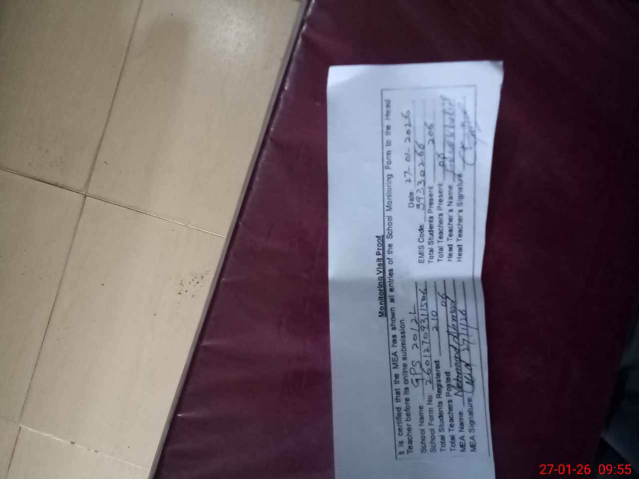 | Attendance Register | Head Teacher | MEA with School | Visit Proof |
