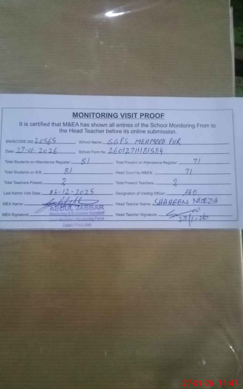 | EMIS Code: 39220565 | Name of School: GGPS MEHMOOD PUR | |||