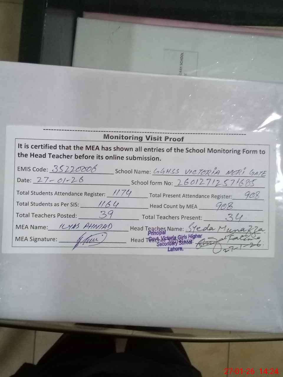 | Attendance Register | Head Teacher | MEA with School | Visit Proof |