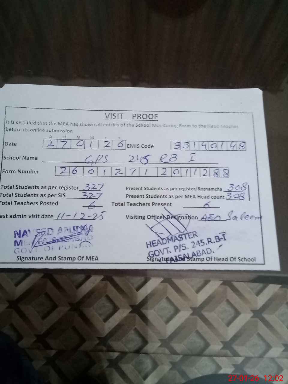 | EMIS Code: 33140148 | Name of School: GPS CHAK 245 RB I | |||