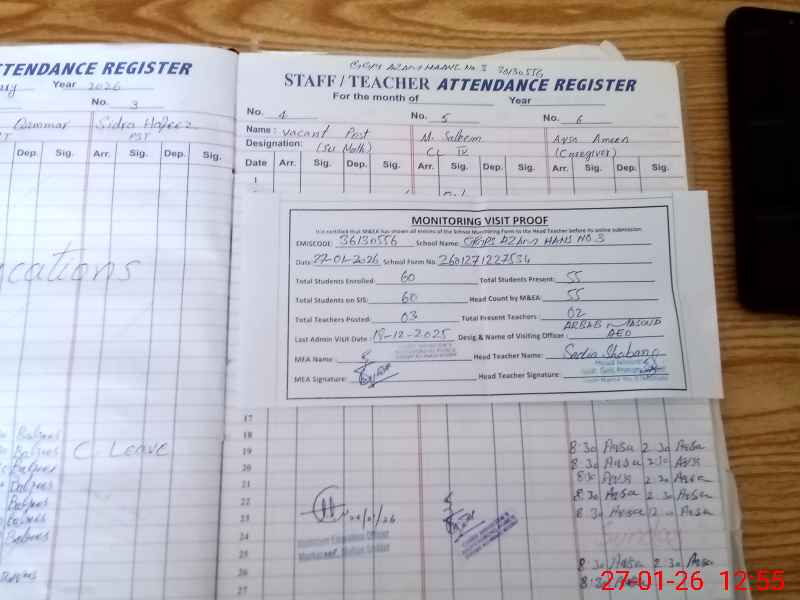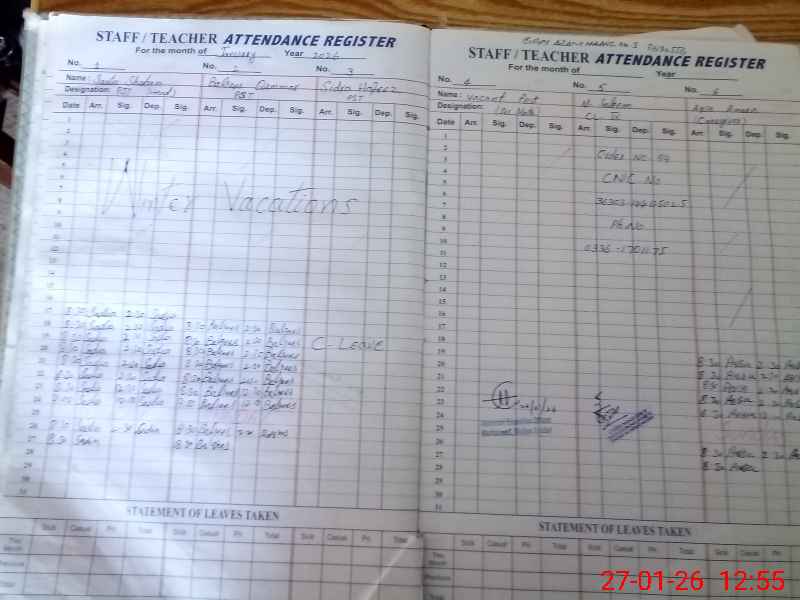 | Total no. of Classrooms: 2 No. of Classrooms Used for Teaching: 2 No. of Classrooms Storing Old Furniture, FTBs, etc: 0Comments if Any: Teacher guide books record not maintained NSB BANK RECORD also not updated PST sidra leave marked without any proof M saleem CHOKIDAR is on other duty without any written order |