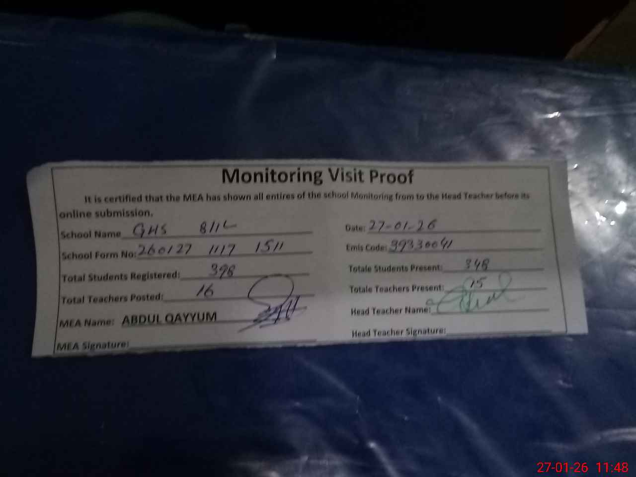 | Attendance Register | Head Teacher | MEA with School | Visit Proof |