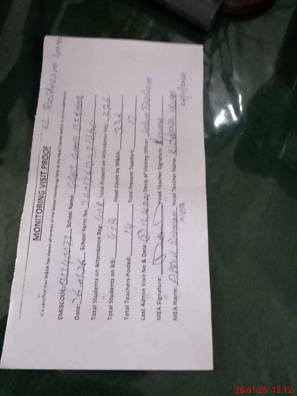 | Attendance Register | Head Teacher | MEA with School | Visit Proof |