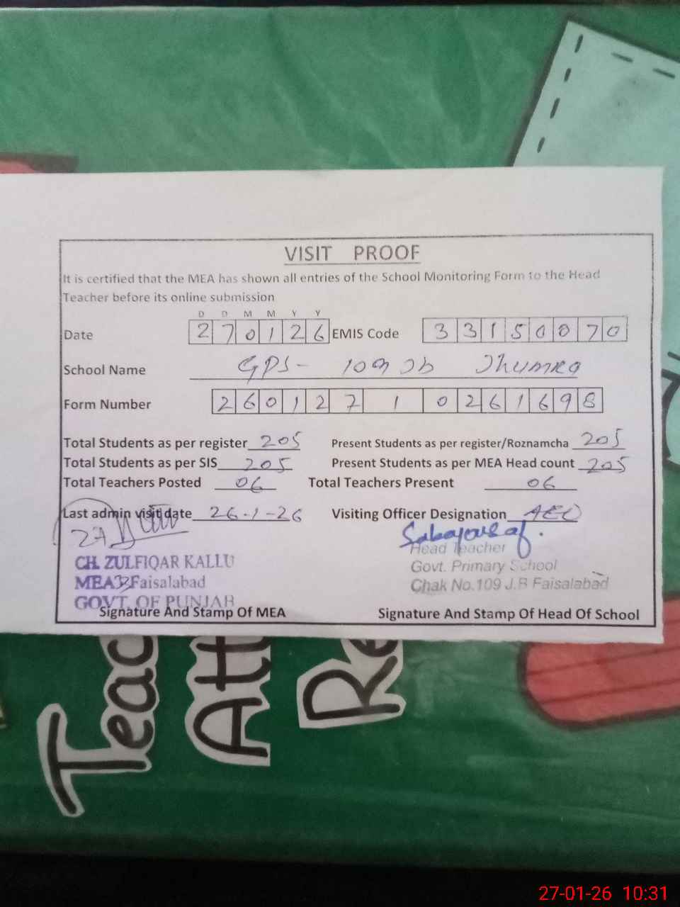 | EMIS Code: 33150070 | Name of School: GPS CHAK NO 109 JB | |||