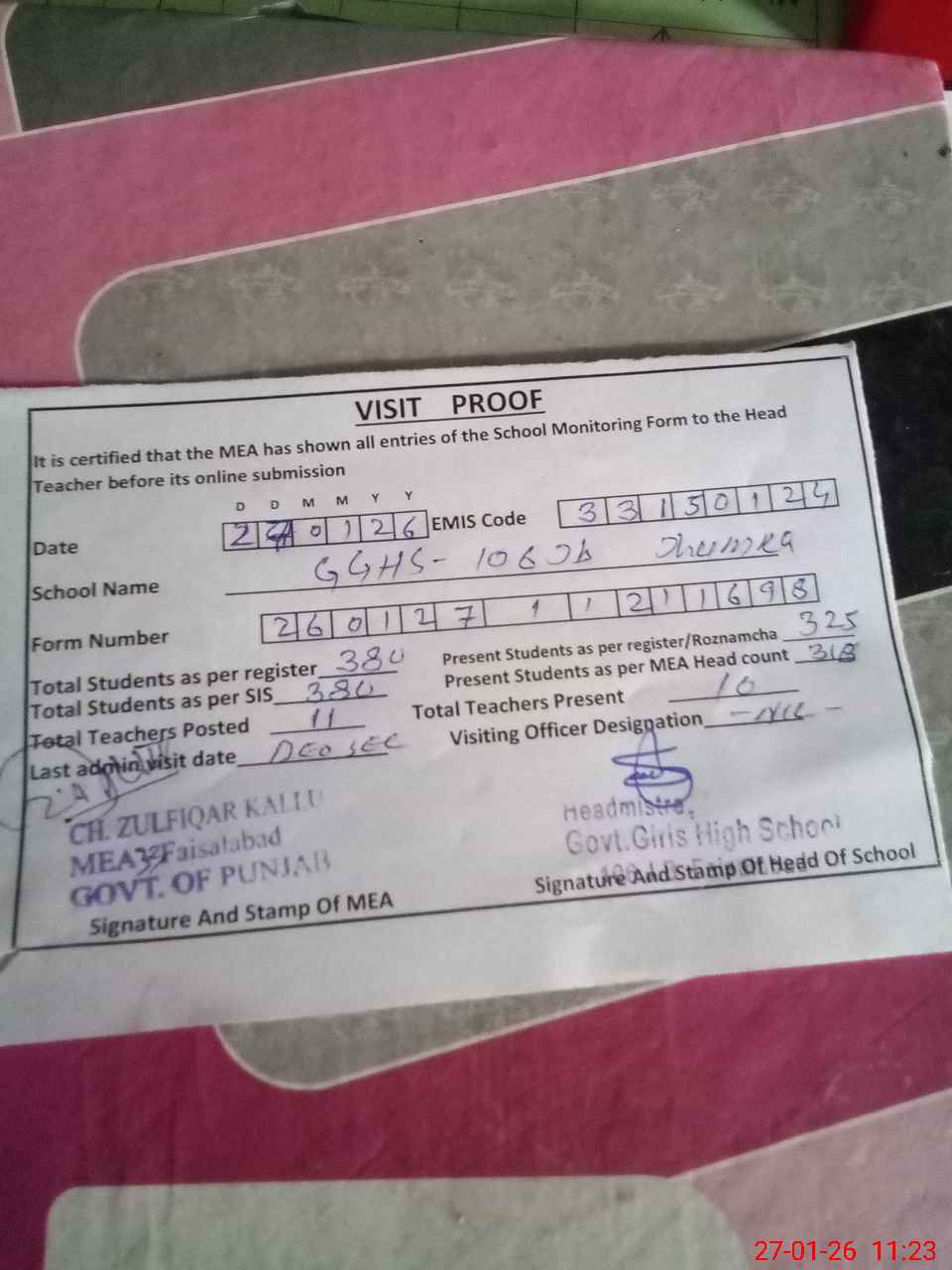 | Attendance Register | Head Teacher | MEA with School | Visit Proof |
