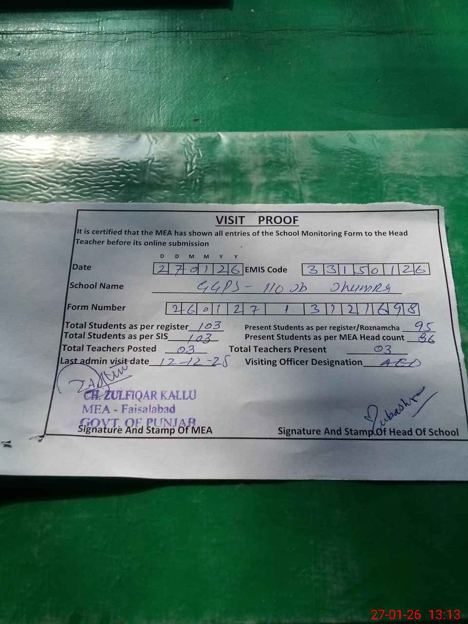 | Attendance Register | Head Teacher | MEA with School | Visit Proof |