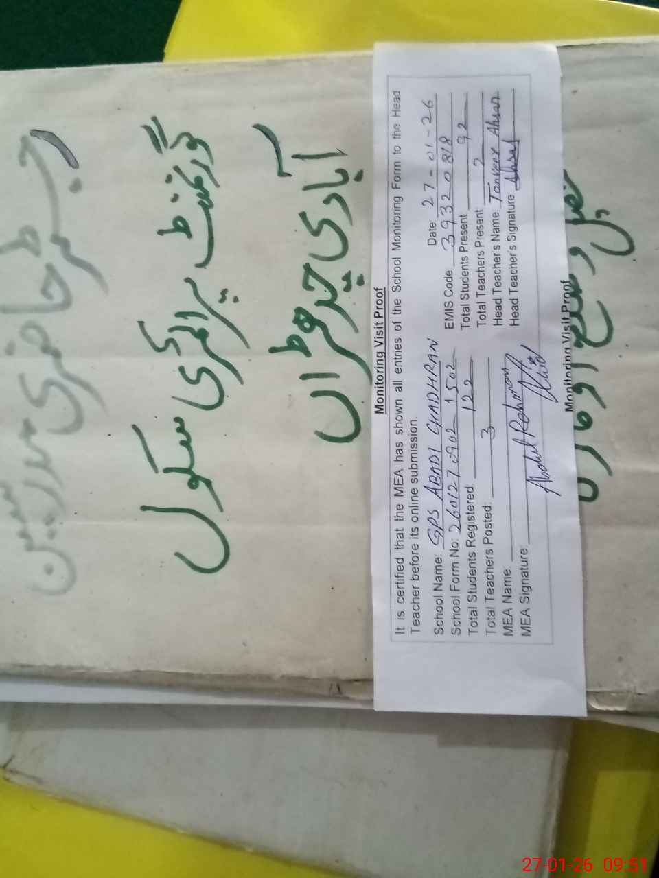| Attendance Register | Head Teacher | MEA with School | Visit Proof |