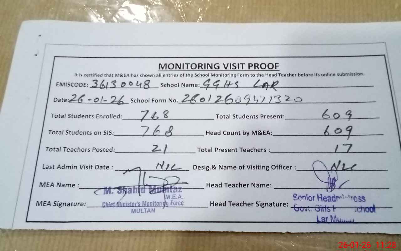 | EMIS Code: 36130048 | Name of School: GGHS LAR MULTAN | |||