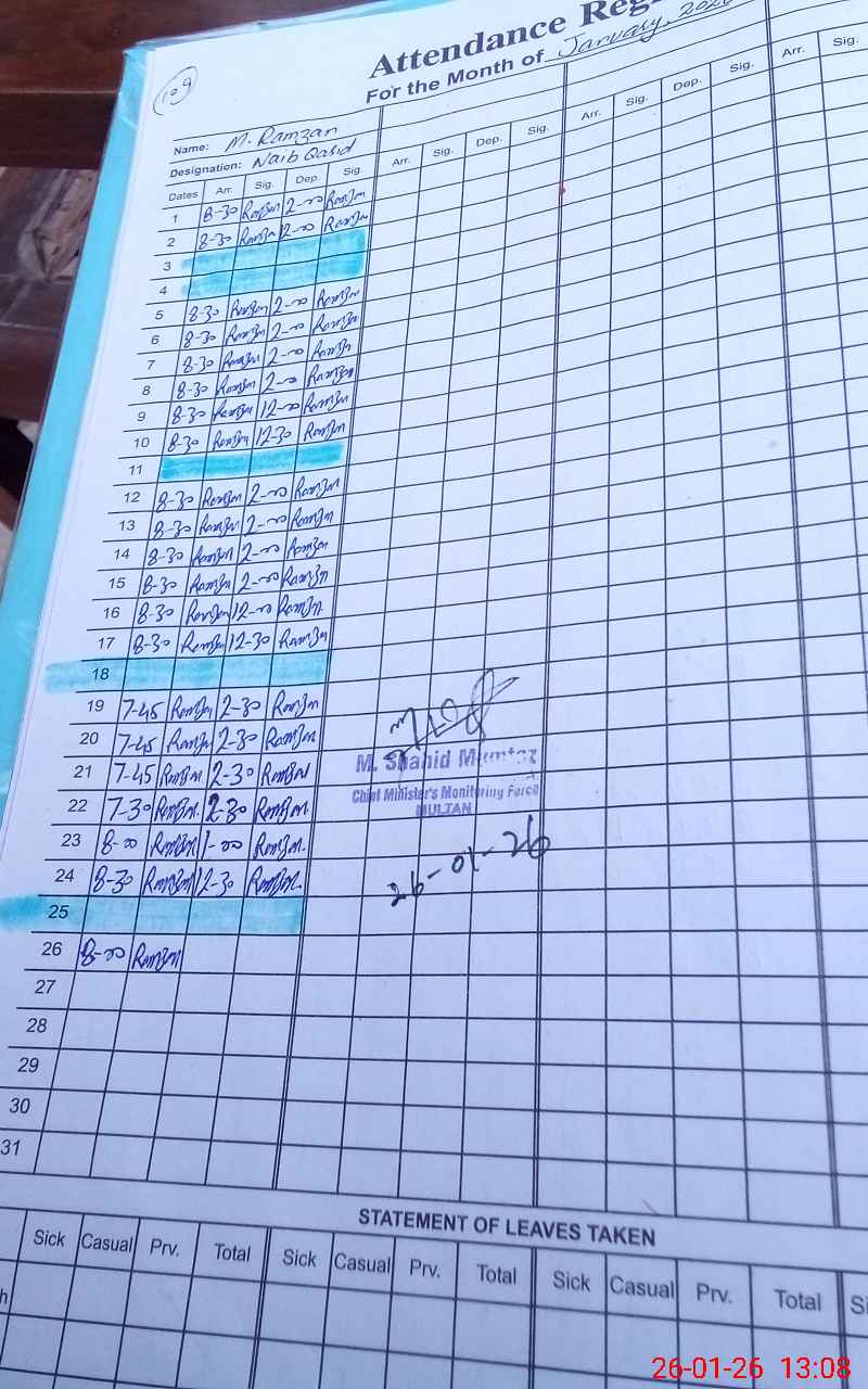 | CNIC | Full Name | Designation | R/C | Absence during last cal. month |