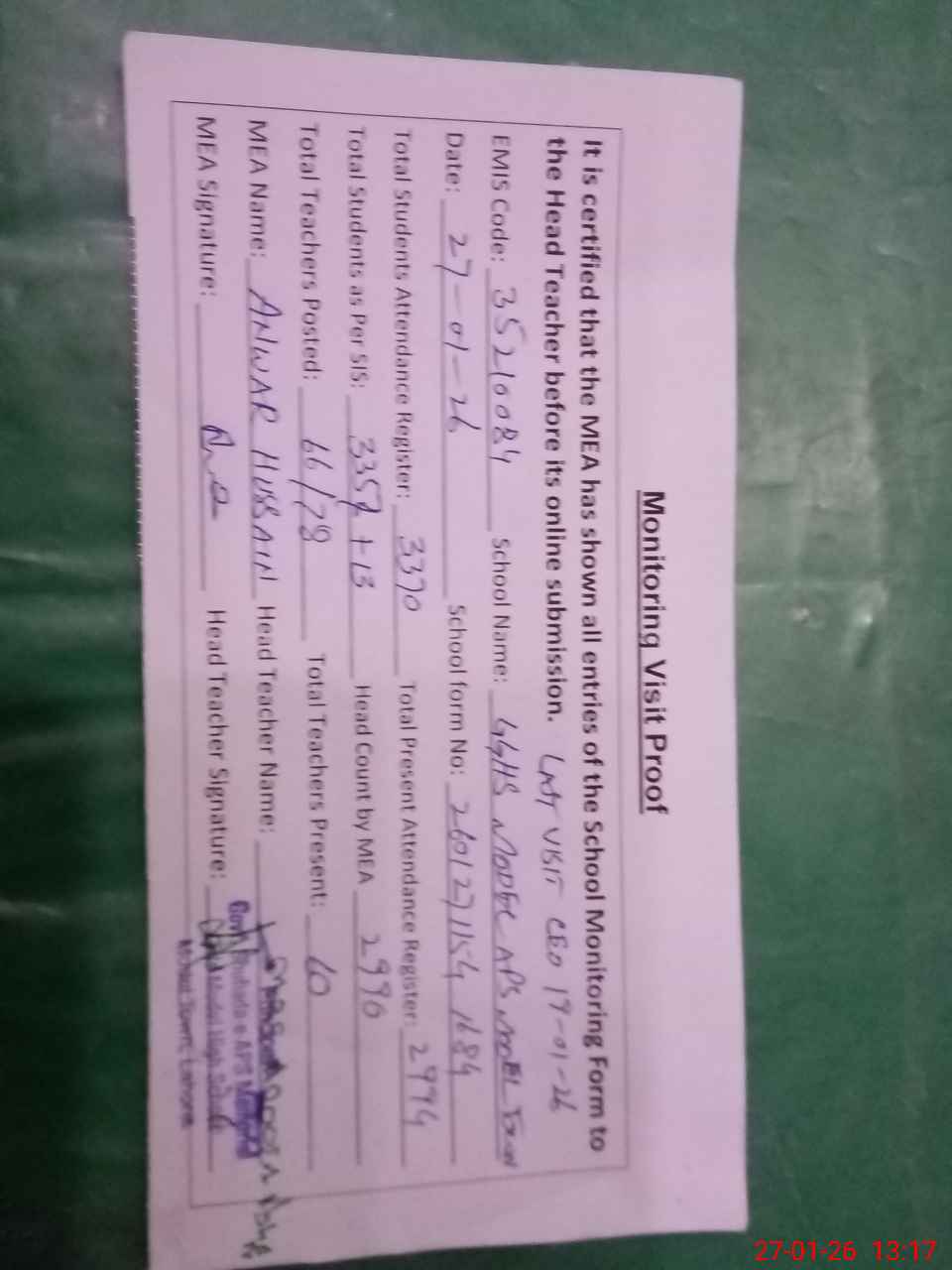 | Attendance Register | Head Teacher | MEA with School | Visit Proof |