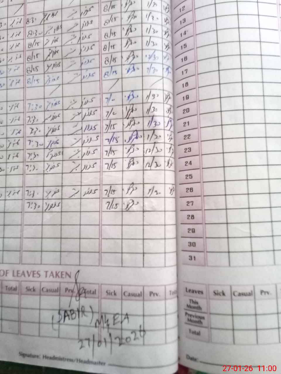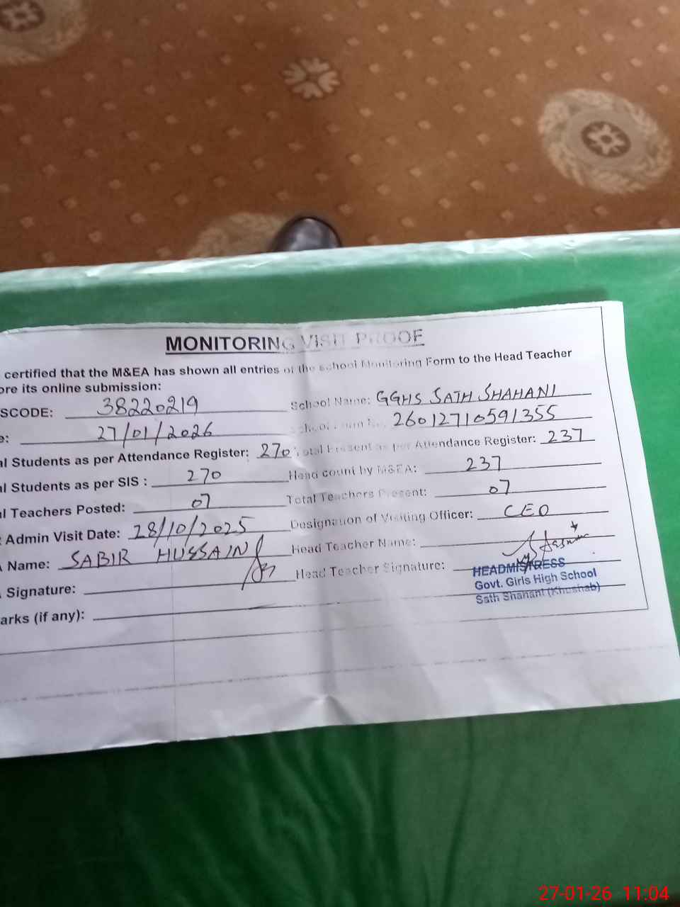 | Remarks (Use Separate Page if Required): no teacher absent total students on register 270 total students on SiS 270 Last admin visit by CEO on 28 Oct 2025 | |||||