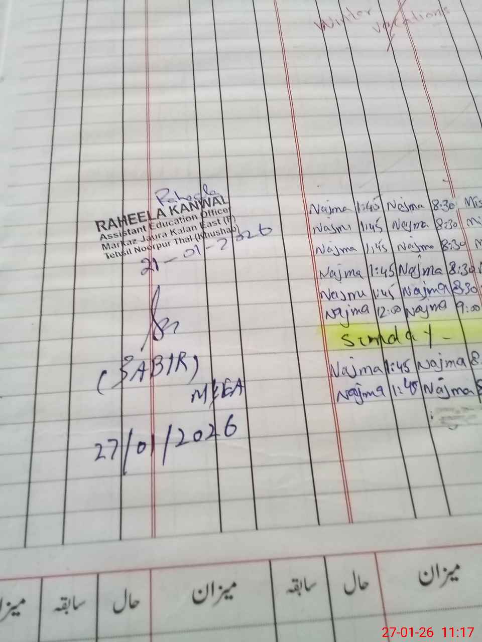 | Remarks (Use Separate Page if Required): no teacher absent total students on register 54 total students on SiS 54 last admin visit by AEO 21 Jan 2026 | |||||