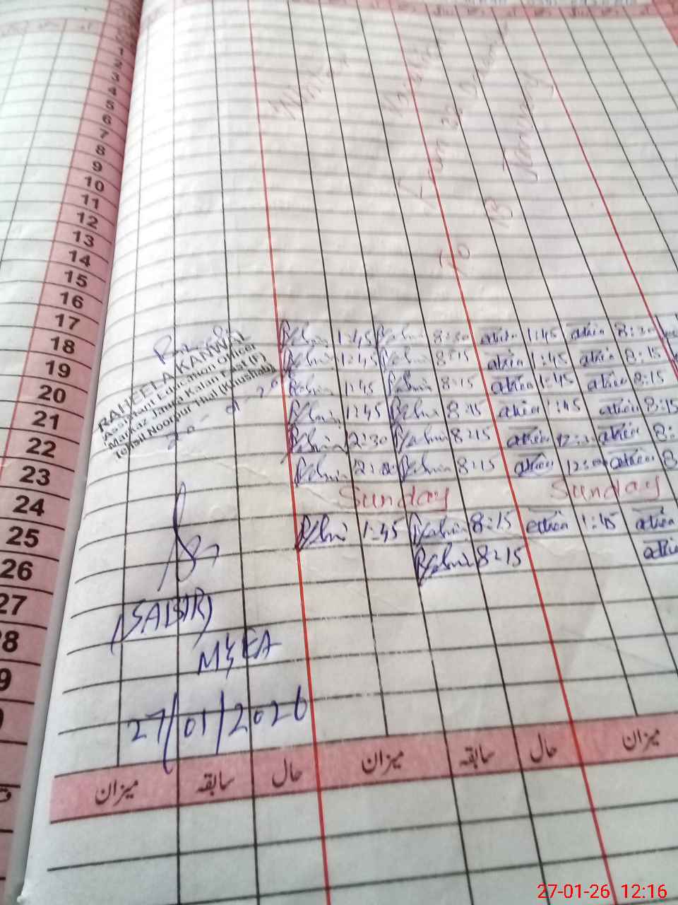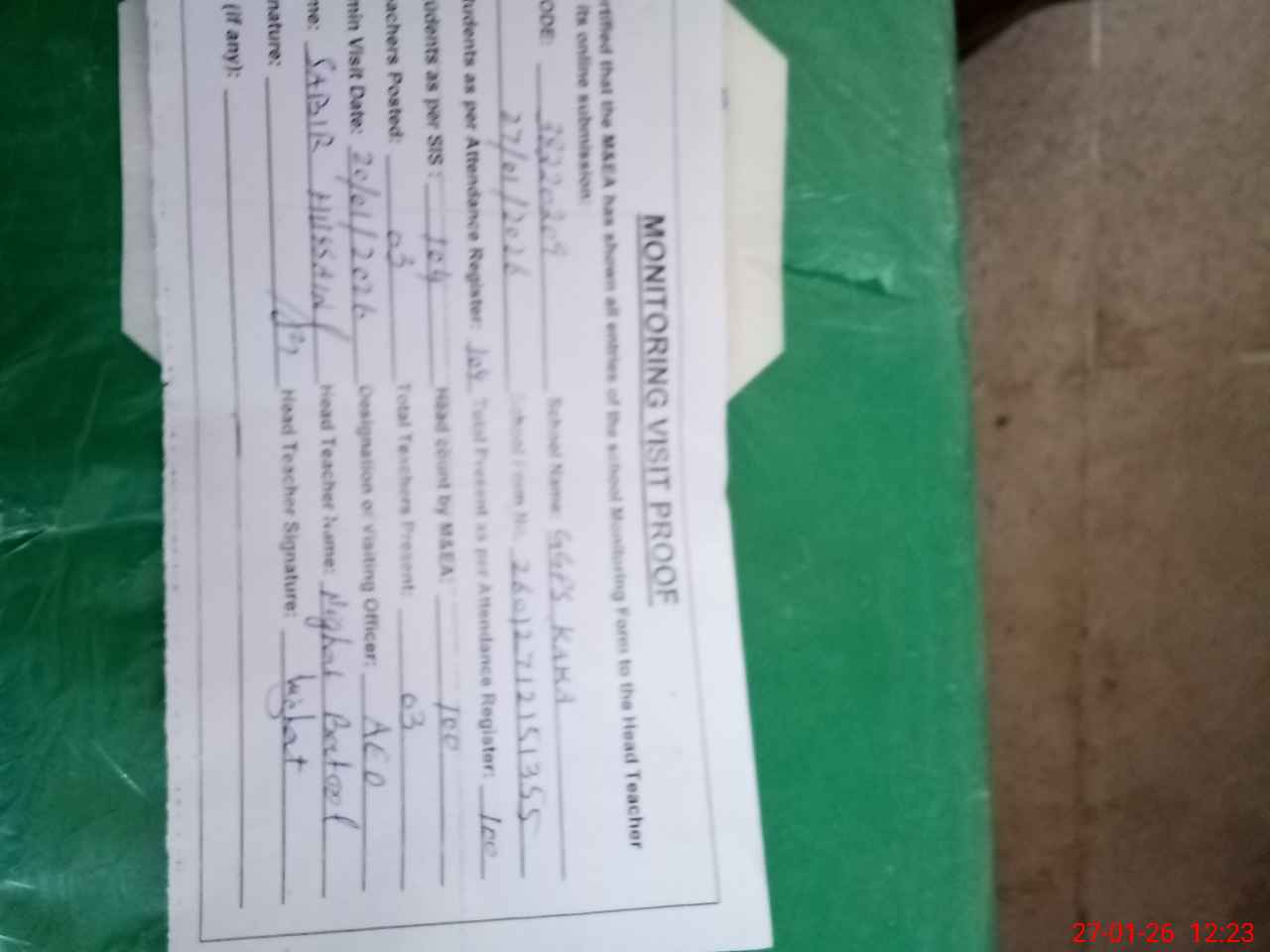 | Remarks (Use Separate Page if Required): no teacher absent total students on register 104 total students on SiS 104 Last admin visit by AEO on 20 Jan 2026 | |||||
