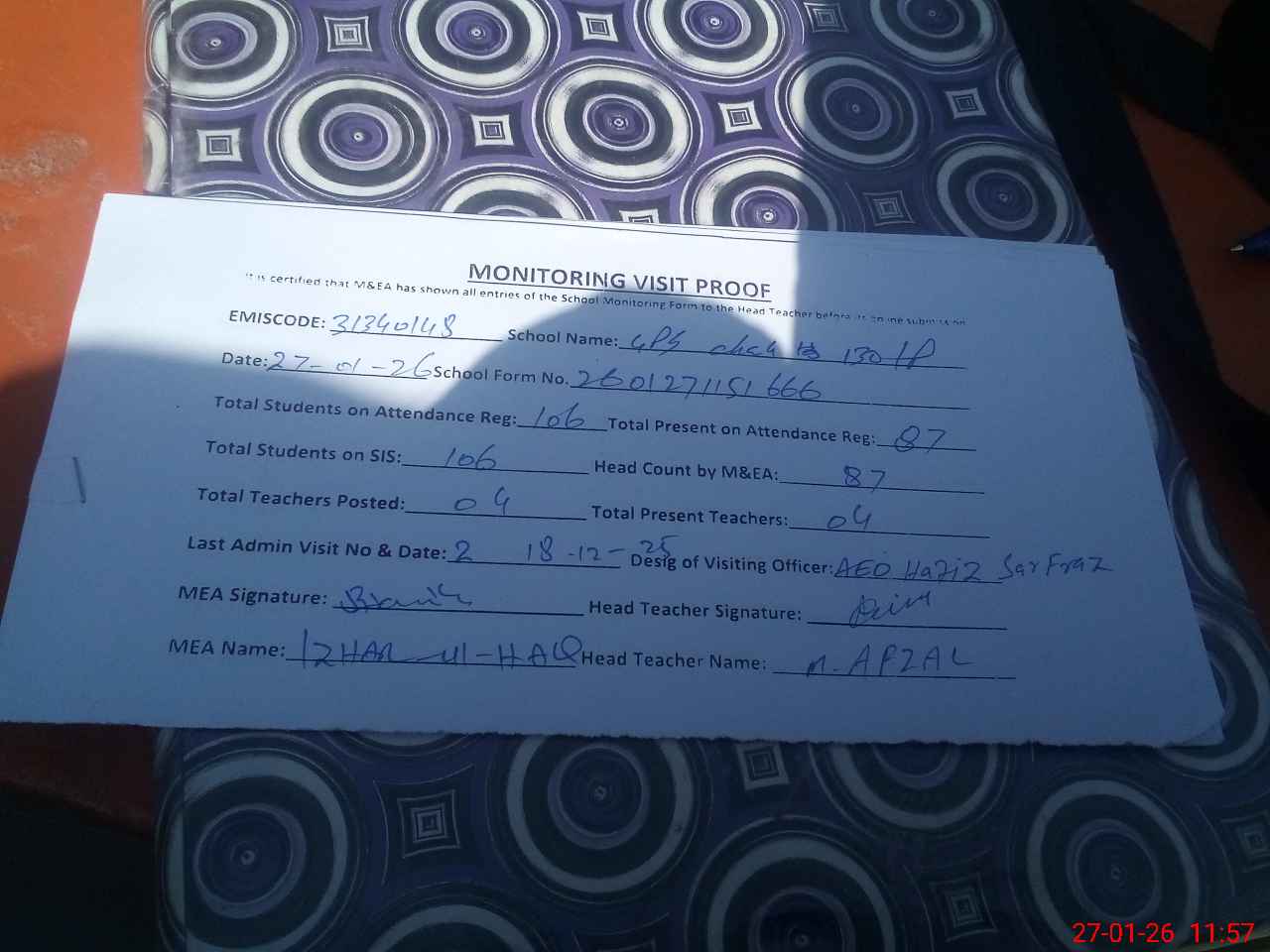 | Attendance Register | Head Teacher | MEA with School | Visit Proof |