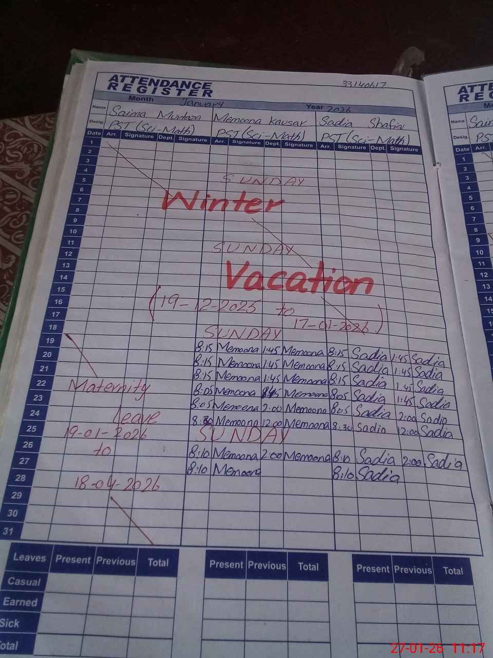 | 33**** | Sa**** Mu**** | PST Science/Maths | Regular | 0 | 0 | 0 | 0 | 0 | 0 | 0 | 0 | 0 | Maternity |