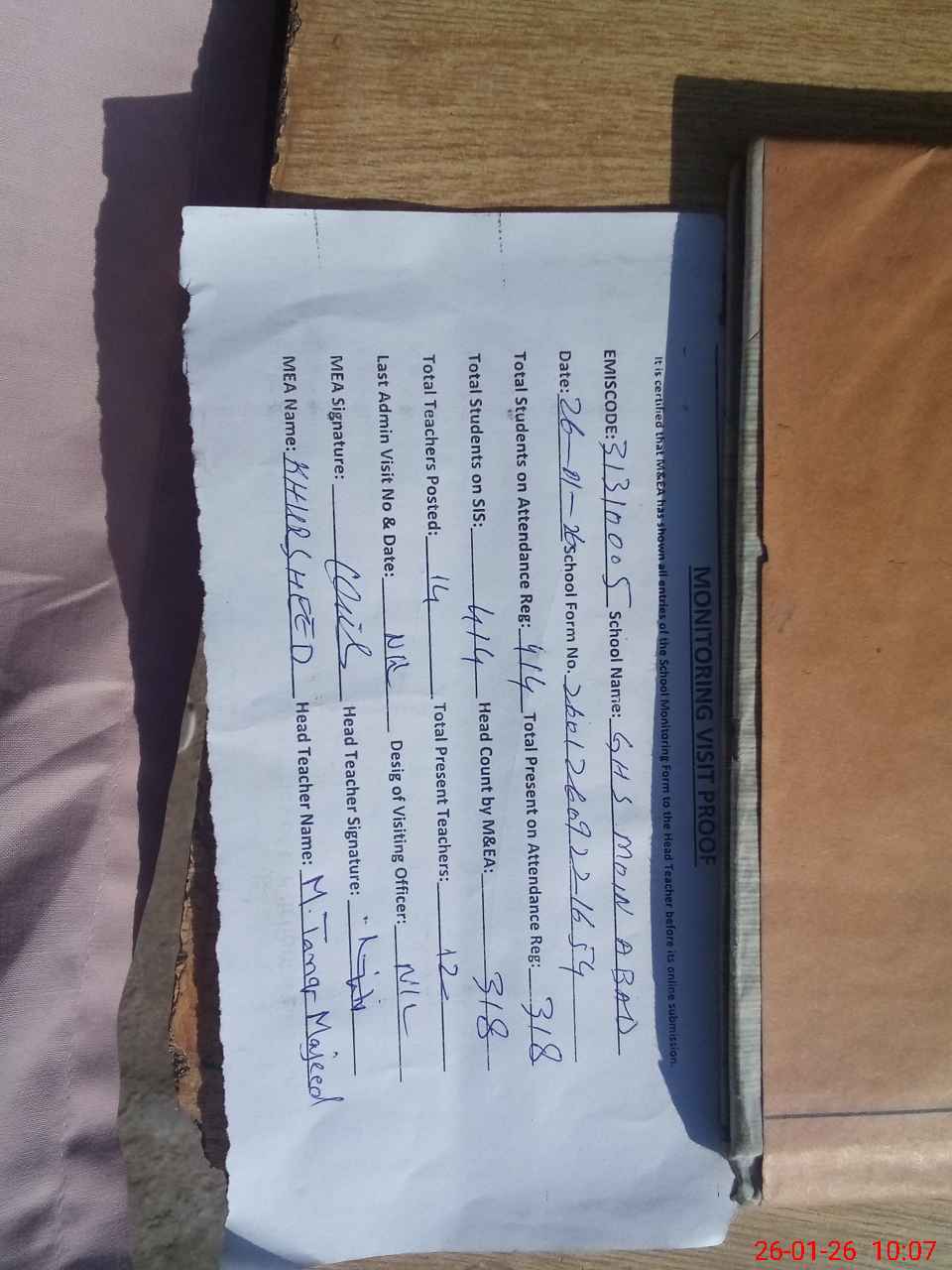 | Attendance Register | Head Teacher | MEA with School | Visit Proof |
