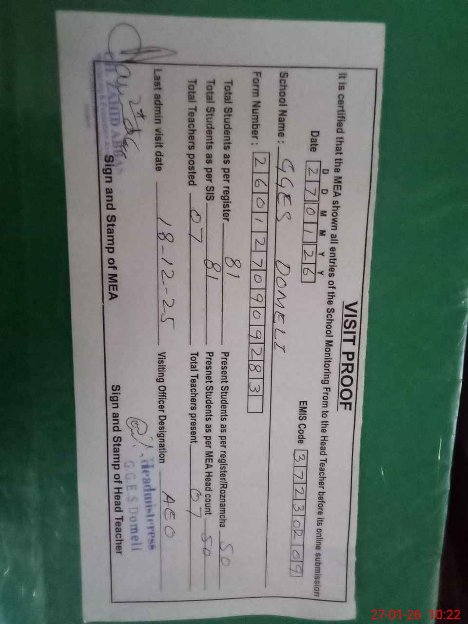 | Certified that this School was Inspected by the Undersigned MEA/DMO Today and the Information Stated Above is as Per Record. | |||||