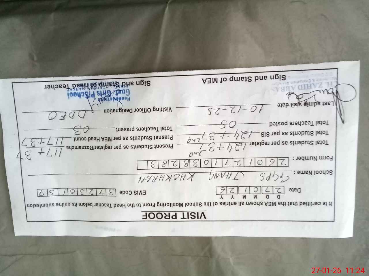 | Attendance Register | Head Teacher | MEA with School | Visit Proof |