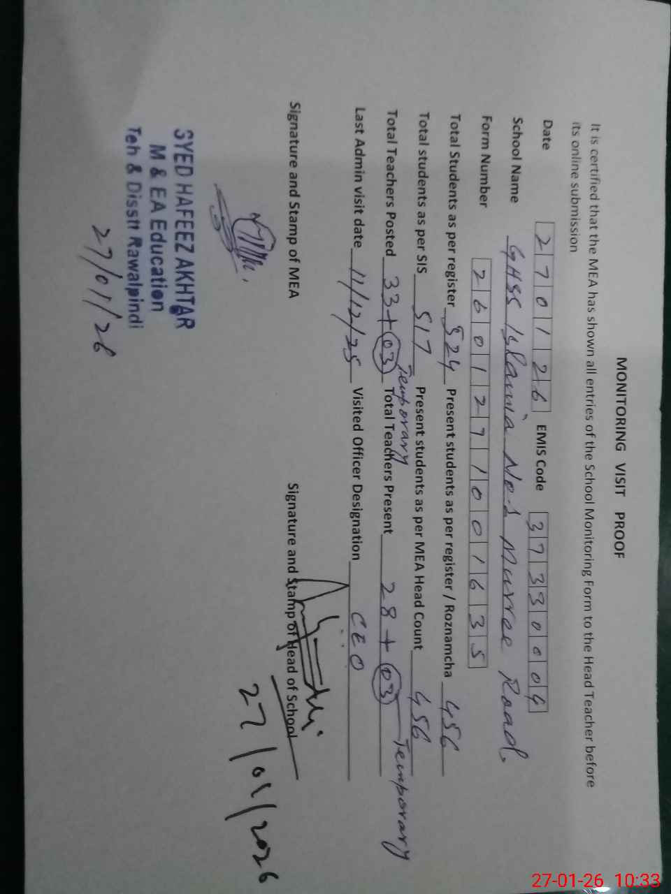 | Remarks (Use Separate Page if Required): Teachers Muhammad Tehseen Javed EST Science Irsa Ghazal EST Science and Riffat Samina are temporarily adjusted in and present in school today While their names are not being shown in pmiu and sis both apps NSB record not updated in pmiu app | |||||