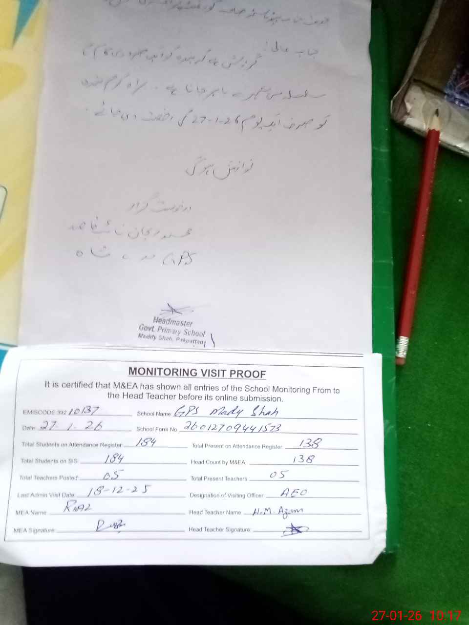 | Attendance Register | Head Teacher | MEA with School | Visit Proof |