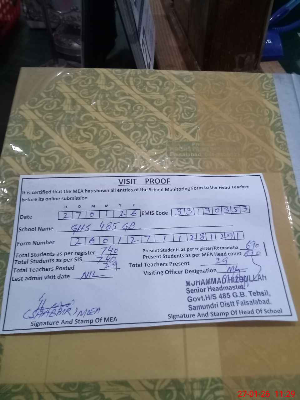 | Attendance Register | Head Teacher | MEA with School | Visit Proof |