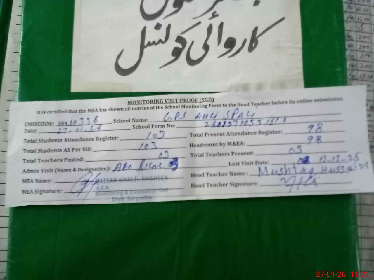 | Attendance Register | Head Teacher | MEA with School | Visit Proof |